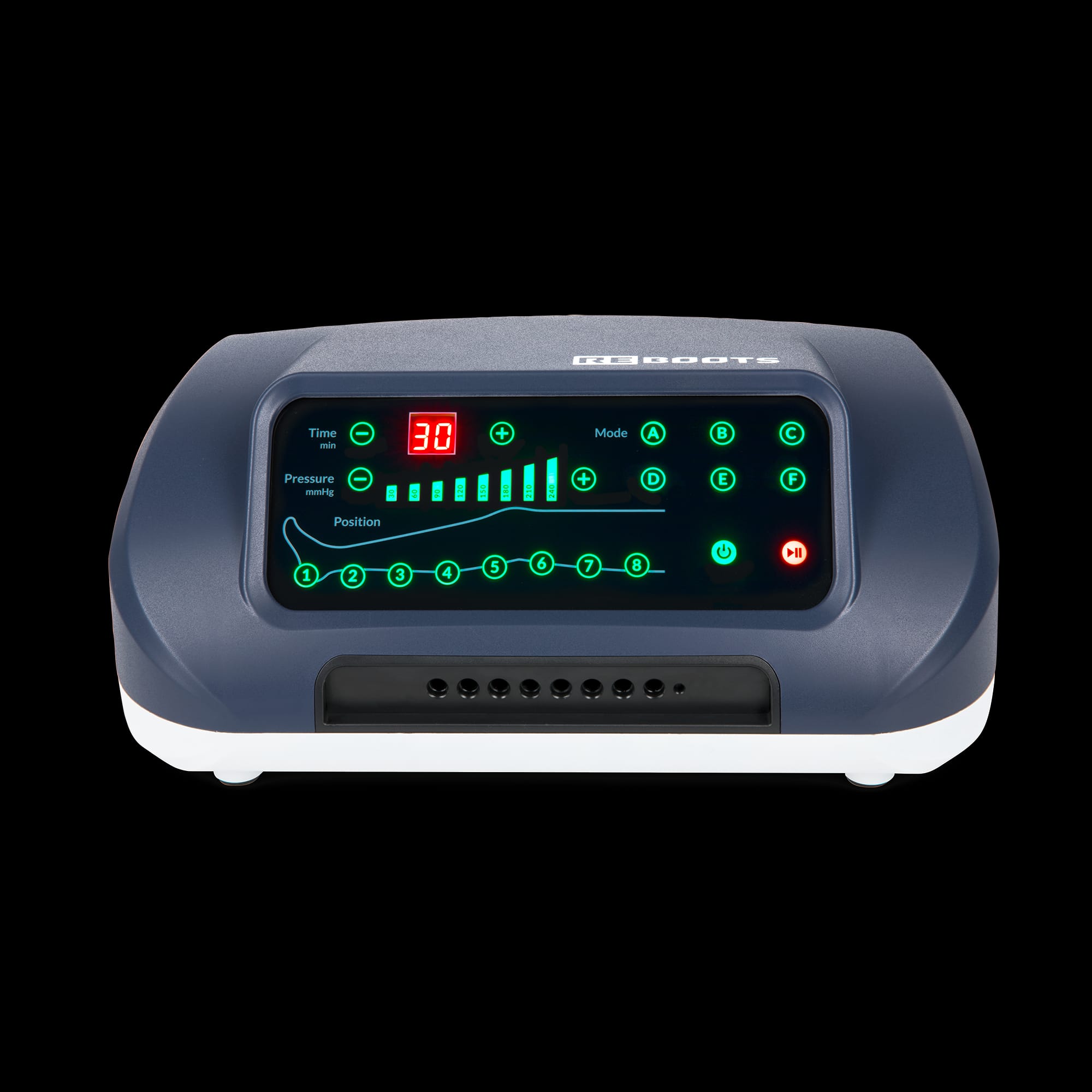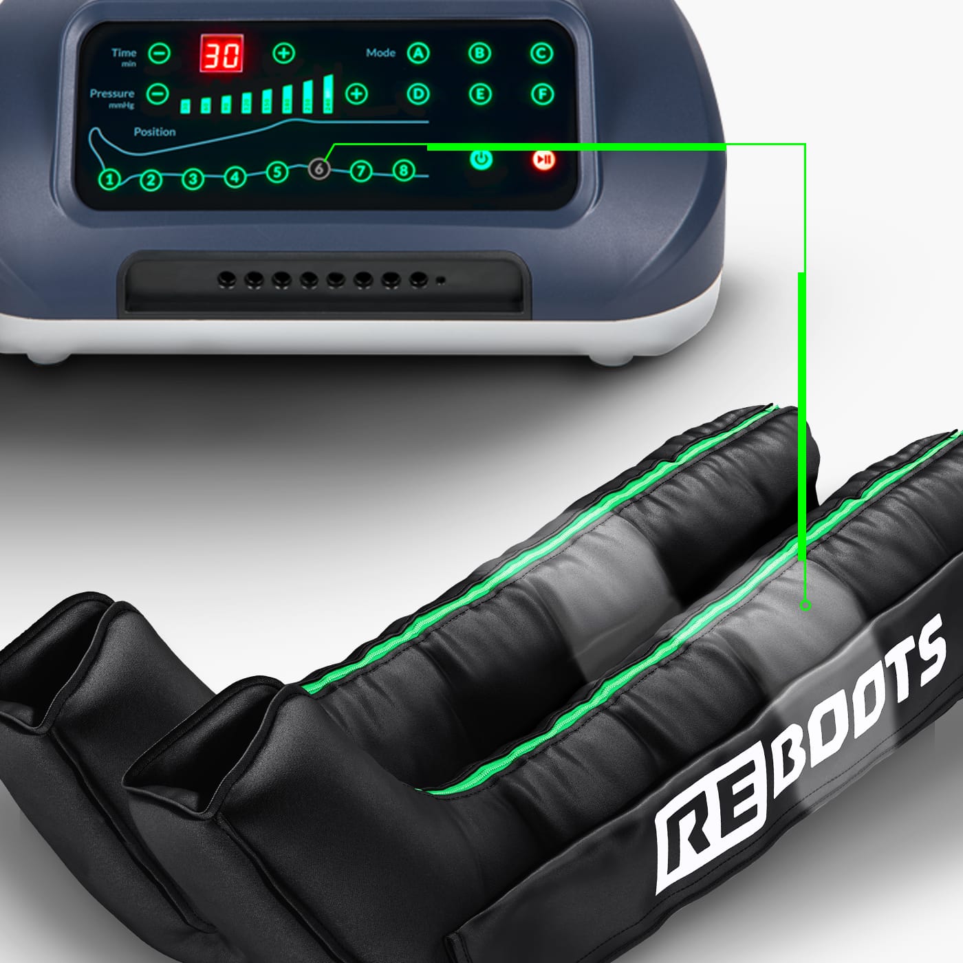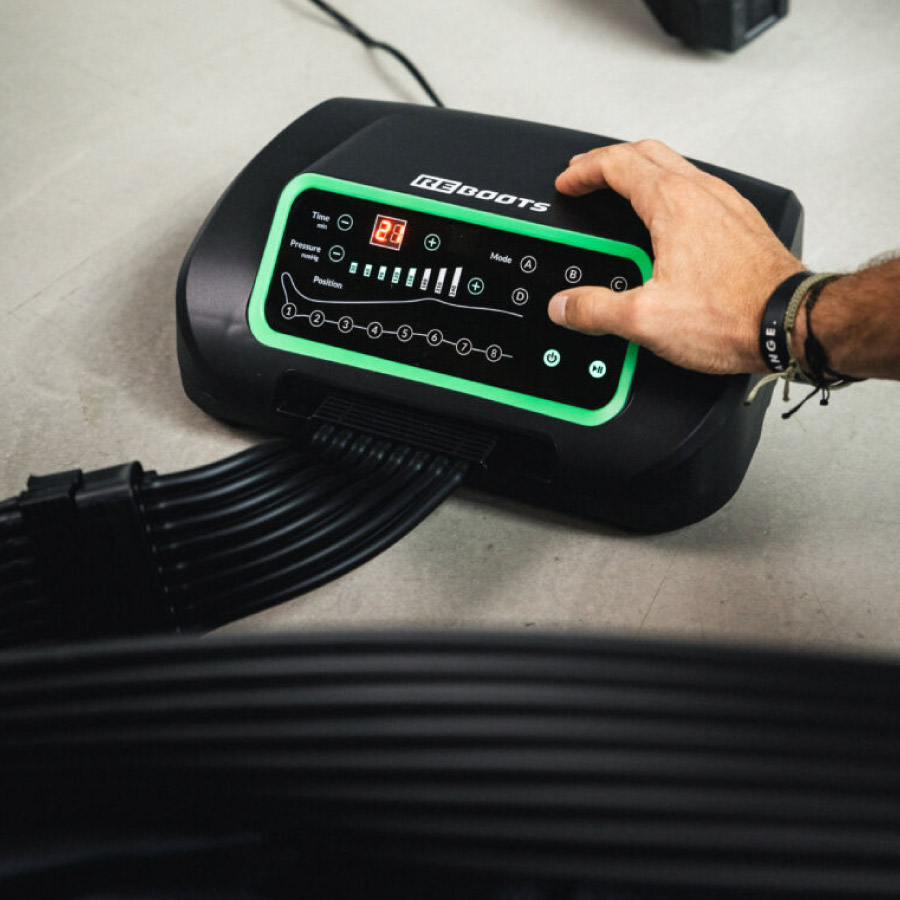 Reboots One kombinira profesionalnu kompresijsku tehnologiju i dizajn prilagođen kućnoj i poluprofesionalnoj upotrebi. Sa 8 komora i mogućnošću tlaka do 240 mmHg pruža učinkovitu masažu za noge, od stopala do bokova, pomažući bržem oporavku i svježem osjećaju.